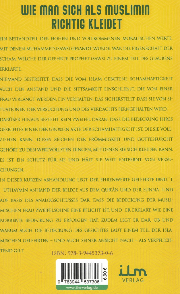 In dieser kurzen Abhandlung legt der ehrenwerte Gelehrte Ibnul Uthaymin anhand der Belege aus dem Quran und der Sunna und auf Basis des Analogschlusses dar, dass die Bedeckung der muslimischen Frau zweifelsohne eine Pflicht ist. Und er erklärt, wie eine korrekte Bedeckung zu erfolgen hat. Zudem legt er dar, ob und warum auch die Bedeckung des Gesichtes laut einem Teil der islamischen Gelehrten – und auch seiner Ansicht nach – als verpflichtend gilt.